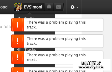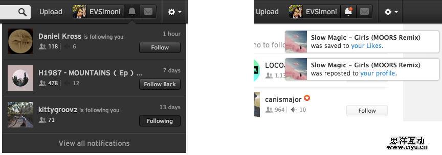 SoundCloud有两类通知。与账号动态相关的通知,显示在导航栏的一个下拉菜单中。页面上也有弹出式通知来标示歌曲动态。