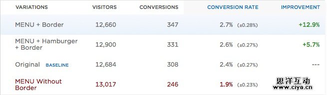 基于第一阶段A/B测试的结果,我们可以明显注意到,在网页上放一个简单的扁平的汉堡图标并不是最佳的方案(注意,是移动端网页而非APP),在按钮上写上“菜单”二字然后加上边框(尽量使它看起来接近于按钮)是用户点击率和转化率最高的方案。