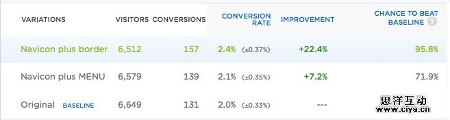 正如同预测的结果那样,单纯的文本“MENU”表现不佳,点击量和转化率无可辩驳地存在于基准线以下。而有意思的是,变种1,也就是加上边框的MENU转化率居然比带边框的汉堡图标还要高!