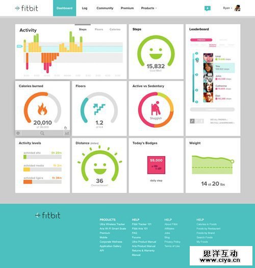 Fitbit的控制面板界面在视觉上表现明亮、大胆而且简单好用。