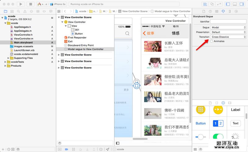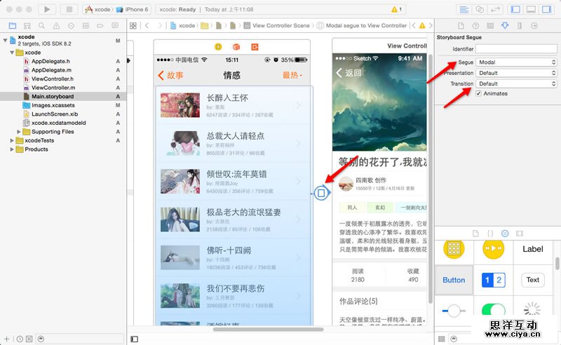 4. 这个时候两个VC中出现了连接线,选中链接线,在右侧属性栏设置transition,也就是跳转动画(自己试试哦)