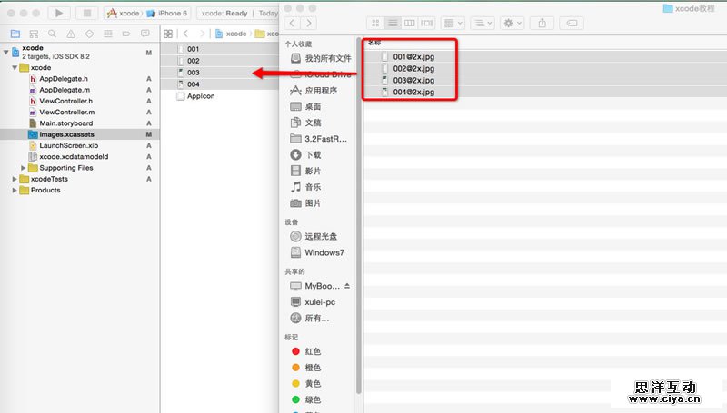 把你刚刚做好的设计稿拖动到第二栏即可。这里为了方便,我们要把文件名加上@2x或者@3x的后缀。这样Xcode可以自动识别该放哪一栏。这样图片文件已经导入到Xcode工程中了,我们可以在image view里调用。