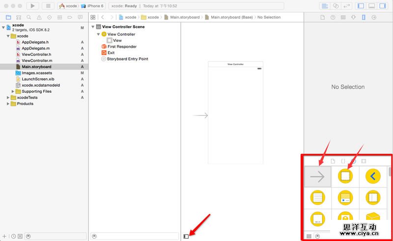 开发人员可以用代码实现无比复杂的功能,那么作为设计师,我们完全可以通过Xcode找到替代品,如下图右侧就是各种的组件,我们可以用组件实现不同的功能,最基本的组件就是最左侧箭头所示的View controller。这个组件是做什么的呢?我们可以尝试拖动一个View controller组件到工作区的空白位置,发现了什么?是的,又生成了一张“画布”!这个奇妙的功能,我只告诉读这篇文的同学啊,很好玩吧?那么View controller左侧的箭头是做什么的呢?好,我们同样拖动一个箭头到一个VC(view controller简写,下同)上,发现了什么?箭头附加到了这个VC的左侧,这个代表我们的故事是从这个VC开始的,也就是这个是启动界面完成后第一次进来的界面啦。