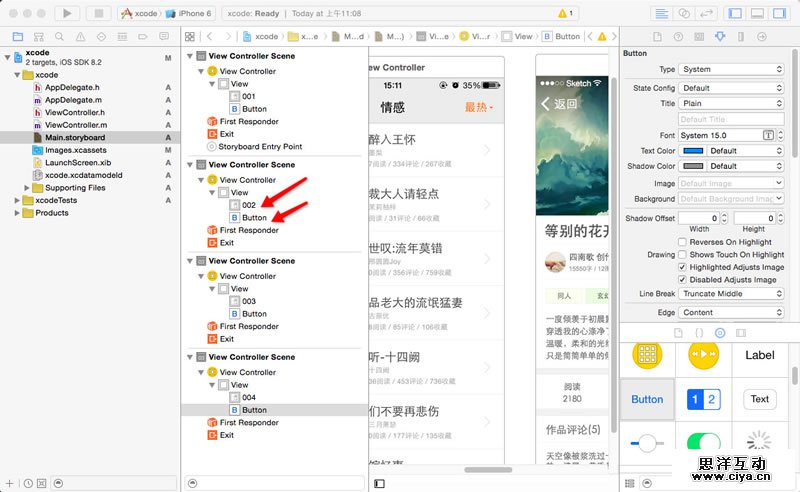 按钮加好后,我们来进行最后一步,也是最关键的一步,让各个“故事版”形成关联。也就是指定一个按钮的去向是哪里?首先选中第一个vc中的按钮,我们要实现的效果是,点击后跳转到第二个界面。