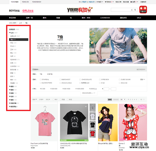 YOHO的商品列表页有利有弊。侧边导航始终存在于页面上,为用户的页面跳转提供了很大程度的便利;但不足之处是侧边导航呈静态,如果能实现动态,可以随着用户鼠标的滚动而始终保持在屏幕之中就更好了。