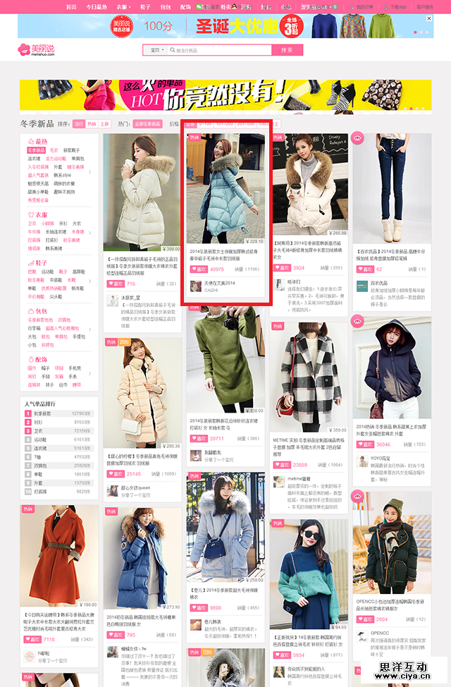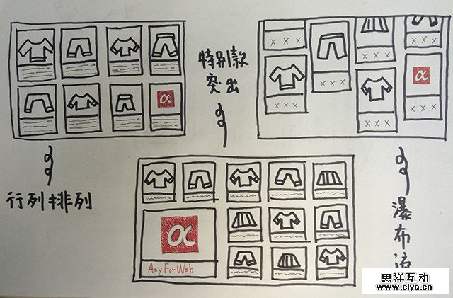 如果商品的种类数量多且繁杂,规规整整的行列排列方式更利于用户找到浏览规律;瀑布流的形式更多的在流行时尚领域的电商中使用;特别款突出的方式可以为一些节日活动的宣传促销而准备。在下面的案例中也会一一提及。