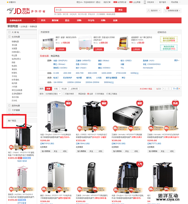商品列表页的死角多见于页面侧边和底部,而京东将这两片区域使用为其他产品的推广途径,比如销量排行和商品精选等。