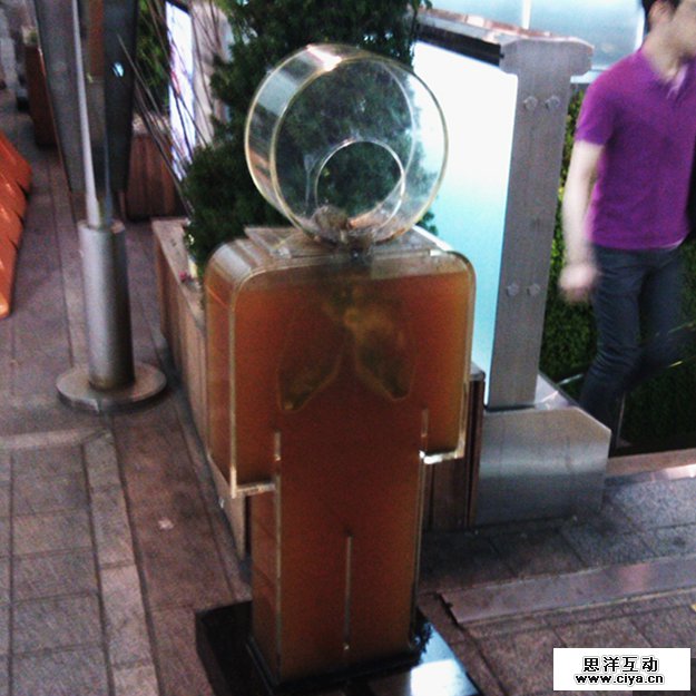 在首尔的几天,除了白天布置展览外,晚上能有自由活动的时间,人生地不熟的我也只能是跟着大部队去东大门购物。在一家商场门口,看到一个人形的烟灰桶,透明亚克力材料,里面充满了棕色的液体,肺脏的轮廓清晰可见(图1)。烟灰和烟灰从头部的嘴巴的位置丢进去,沉到肺里。恶心吧?嗯。