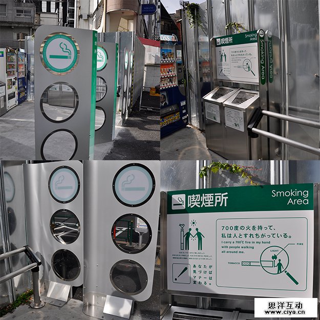 从城市的公共设施更容易分析设计者的社会视角。所以还是聊聊吸烟问题,日本是在街道上禁止吸烟的,但是走着走着烟瘾犯了怎么办?当然不能完全不顾及烟民的感受,所以在东京街头,经常看到吸烟隔离区(图3)。基本的结构都是通过金属或玻璃隔板划出一块十几平米的区域,里面放置几个烟灰桶。你要吸烟,那么请到吸烟区,过完瘾再出来。不仅在街头,地铁站等公共场所都有专门的吸烟隔离区。我在国内从没看到专门的吸烟隔离区,基本上都是哪儿有烟灰桶,哪儿就是吸烟区。