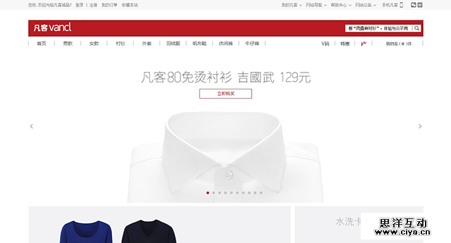 凡客诚品的首屏走的是极简路线,没有什么修饰,让用户可以专注于商品本身。配图没有把商品全貌都展现出来,但在极简的风格下,也能增强用户的点击欲。
