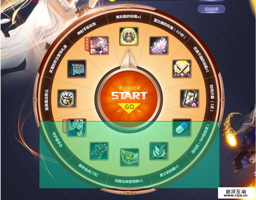 好了,不卖关子了。这个转盘的最好的细节处理的地方就在于奖品的名称那里,通常我们在处理这类圆形路径上写字的情况,都是直接画个圆形的路径,完了之后在路径上直接打字,再去调整文字之间的间距,这样呢势必会造成一个问题——会有至多一半的名称是倒着的。这样呢会给浏览者在阅读的时候造成一定的障碍,这里设计师正式考虑到了这一微小的细节,所以通过一定的方法使所有的名称相对于水平线而言都是偏正方向的,这样用户在阅读名称的时候就会很容易识别。