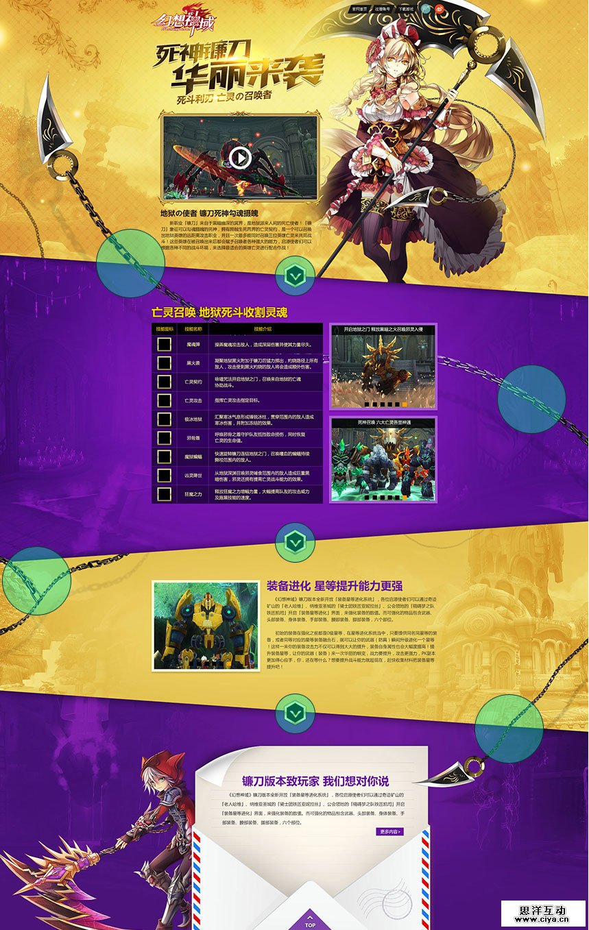 这是一个内容比较多的页面,这里设计师把每个大部分的内容用色块进行区分。倘若只是单纯的用色块来分割每一块的内容,那分割处会显得比较生硬,而且容易给人造成内容脱离的感觉,不具有整体性。这里设计师巧妙地运用铁链+镰刀的尖头构成一件武器,从而将页面的各个版块贯穿起来,这里链条不仅起到引导作用,而且还能拉开页面的层次,这是个非常棒的处理。
