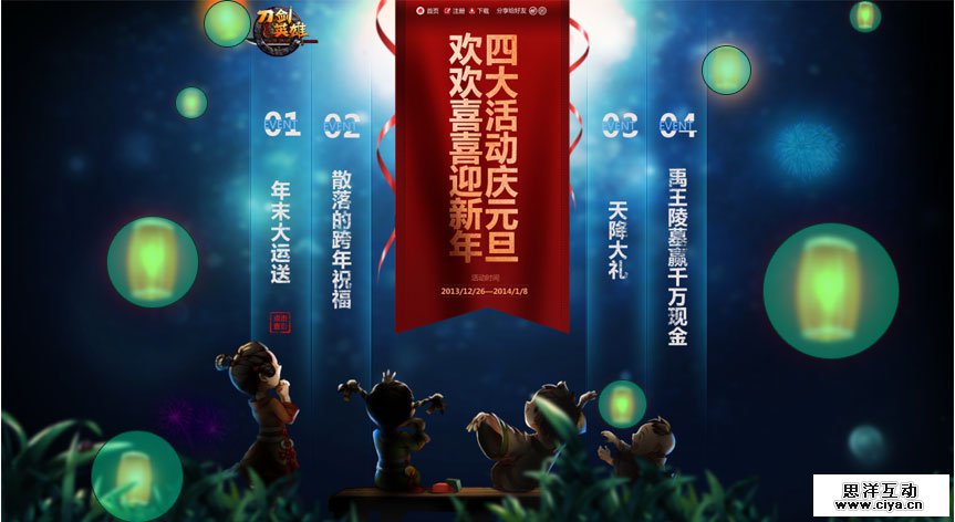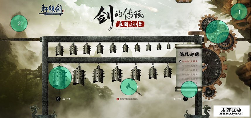 上图是一个非常棒的引导案例,设计师在处理的时候通过素材的拼凑叠加,做出右侧齿轮机关的导航形式;在交互上通过浏览者操控锤子去敲击磬(Qing),增加了页面的趣味性;而且在场景的打造上,圈1中的近景与圈2所处的远景拉开层次,近大远小,近清晰远模糊,画面的纵深感比较强。我们再看一下下面这个例子,看看它的引导是怎么做的。