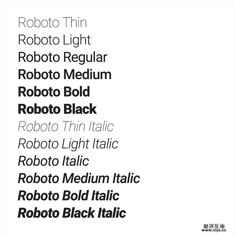Roboto有6种字重:Thin、Light、Regular、Medium、Bold 和 Black。