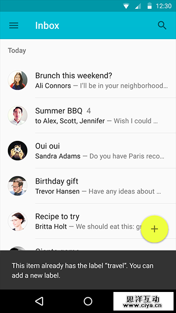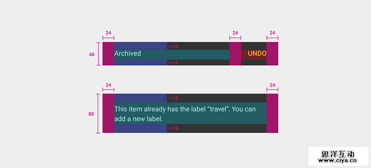 Snackbars至多包含一个操作项,不能包含图标。不能出现一个以上的Snackbars。