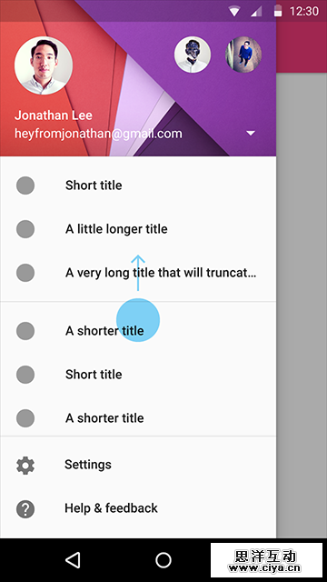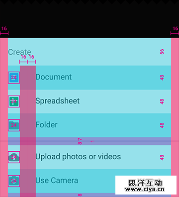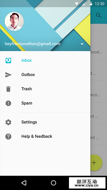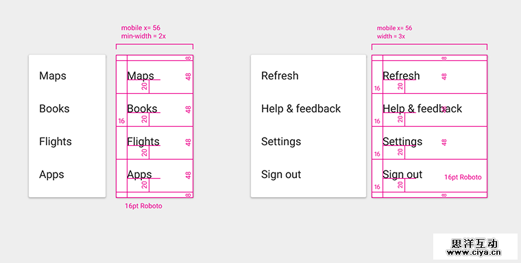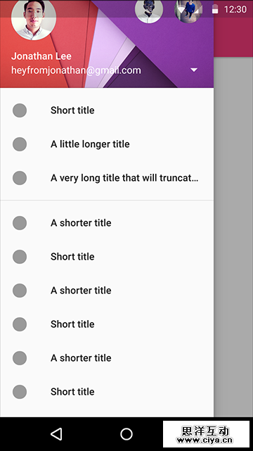 侧边抽屉从左侧滑出,占据整个屏幕高度,遵循普通列表的布局规则。手机端的侧边抽屉距离屏幕右侧56dp。