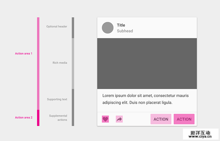 卡片最多有两块操作区域。辅助操作区至多包含两个操作项,更多操作需要使用下拉菜单。其余部分都是主操作区。