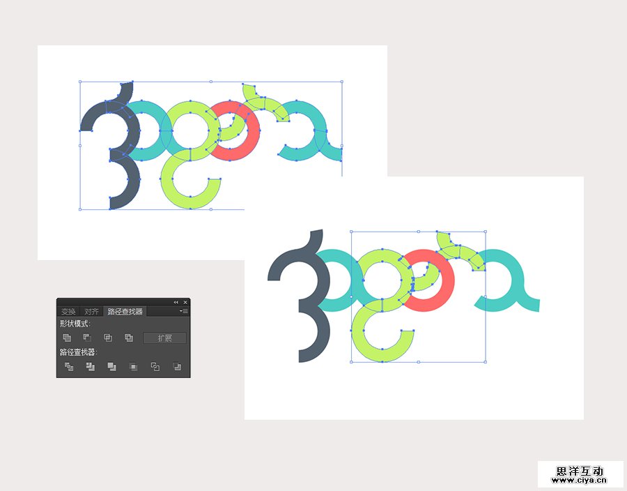 这里,我献上我的解决办法,当然,你的办法或者更巧妙。我将整个图形选中后,用ctrl+shift+F9调出路径查找器,点击“分割”,也就是左下的那个小图标。这样,我就将这个图形四分五裂了,在我们要添加渐变的这个部分里,将叠放到底部被遮挡的部分抛弃,将看得见的部分选择之后,再编组,编组后的图形,点选路径查找器中的合并(即下排左边开始第三个小图标)。这样,添加渐变填色就不在话下了。