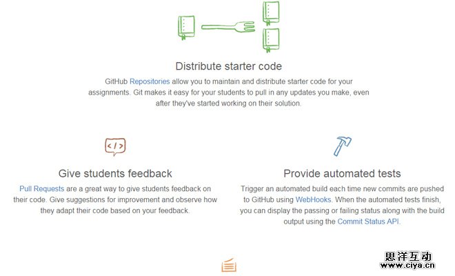 我最喜欢的案例就是GitHub的教学页面。页头使用Github的吉祥物和粉笔黑板营造出教育的氛围,当你向下滚动的时候,每个板块都有单独对应的图标,为你说明这以块是干啥的。