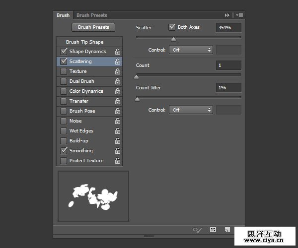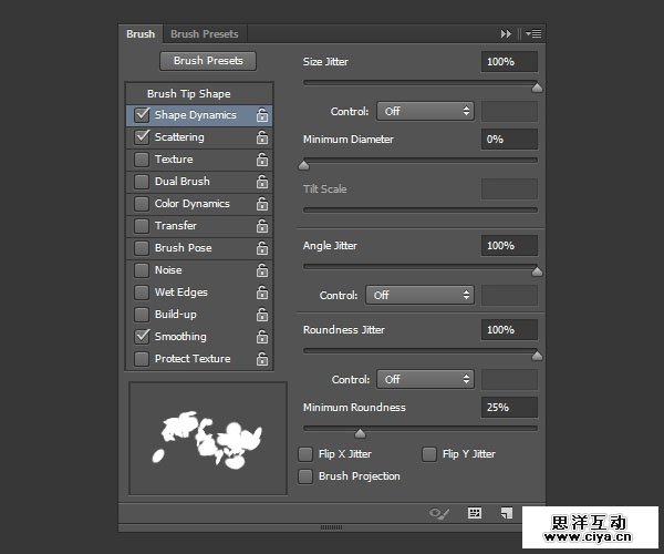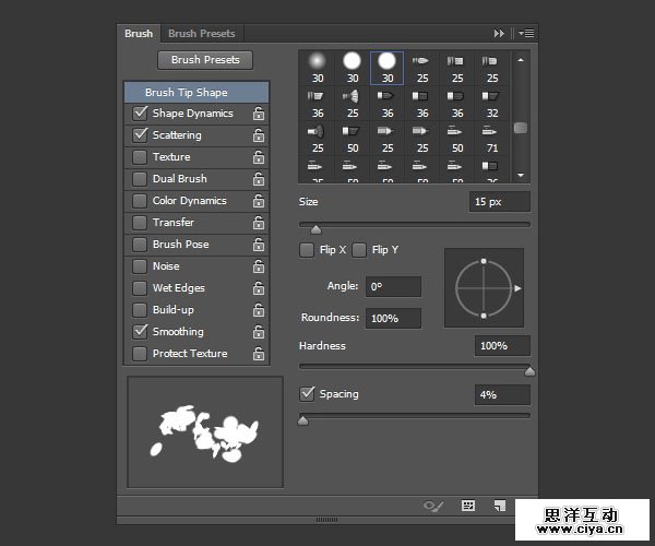 使用画笔工具并打开画笔。继续使用硬圆笔尖,其它设置如下: