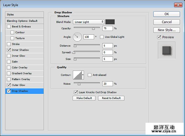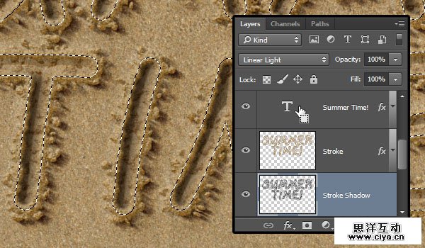 把Stroke Shadow图层的混合模式改为线性光,然后使用移动工具 (V),单击并拖动这个影子,使他看起来像是自然投影下来的。