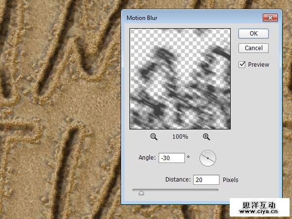 选择Stroke Shadow图层,然后在滤镜 > 模糊> 动感模糊中把角度改为-30,并把距离改到20。