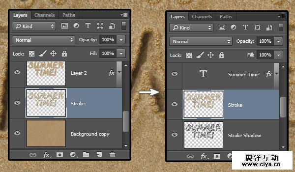 右键单击图层 1,选择复制图层样式,然后右键单击Stroke图层,并选择粘贴图层样式,这样这个新的沙子描边就有了样式。