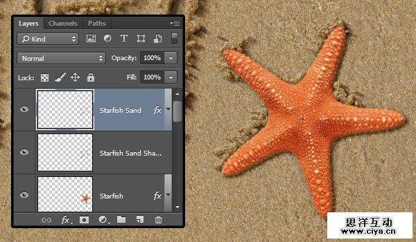 接下来你要做的,是使用在第8步做出来的画笔,手工添加一些边缘,然后重复第9-1到10-2步的方式为其增加影子。最后Ctrl+单击海星的略缩图创建选取,选择海星的描边图层,然后按Delete(删除) 来删除描边内部的影子。