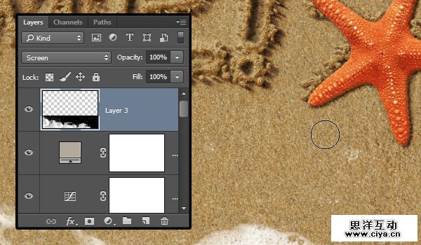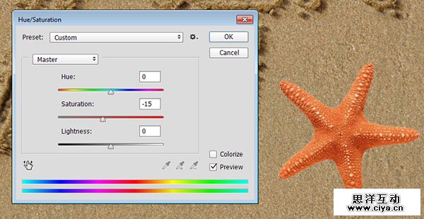 回到原本的文档,使用编辑 > 粘贴,并把海星放在所有图层上面。使用图像 > 调整 > 色相/饱和度,把饱和度降低到 -15,以降低一点颜色饱和。
