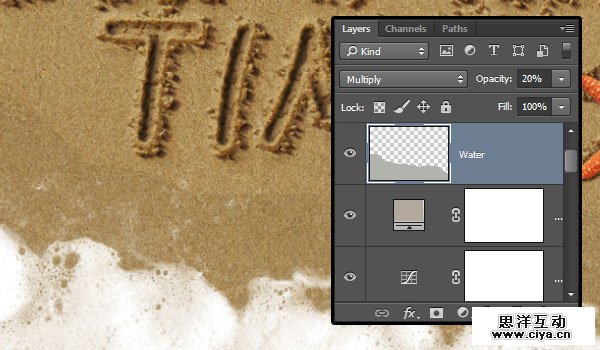 选择 > 取消选择。把Water图层的混合模式改成正片叠底,并把不透明度改为20%。