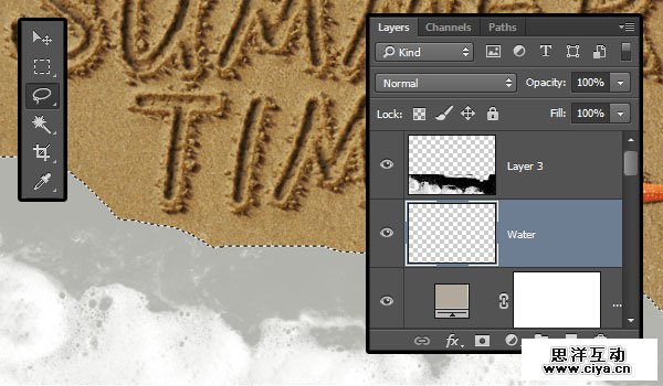 在泡沫下面新建一个图层Water。使用套索工具跟着泡沫的边缘画一个选区,稍微留一点距离,然后用#b2b3ad填充选区。