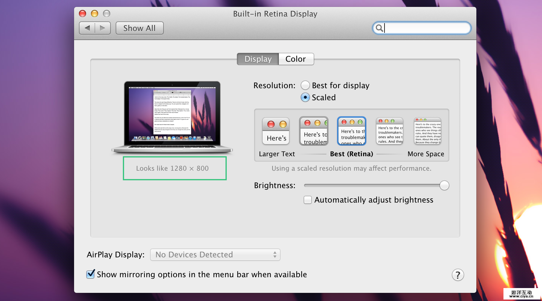 这就是为什么当你想要改变一台Retina Macbook Pro的分辨率的时候,系统会展示下面的窗口来让你知道(下面的屏幕截图)这个分辨率会“看着像”1280*800px,它采用用户的分辨率经验来表达尺寸比例。