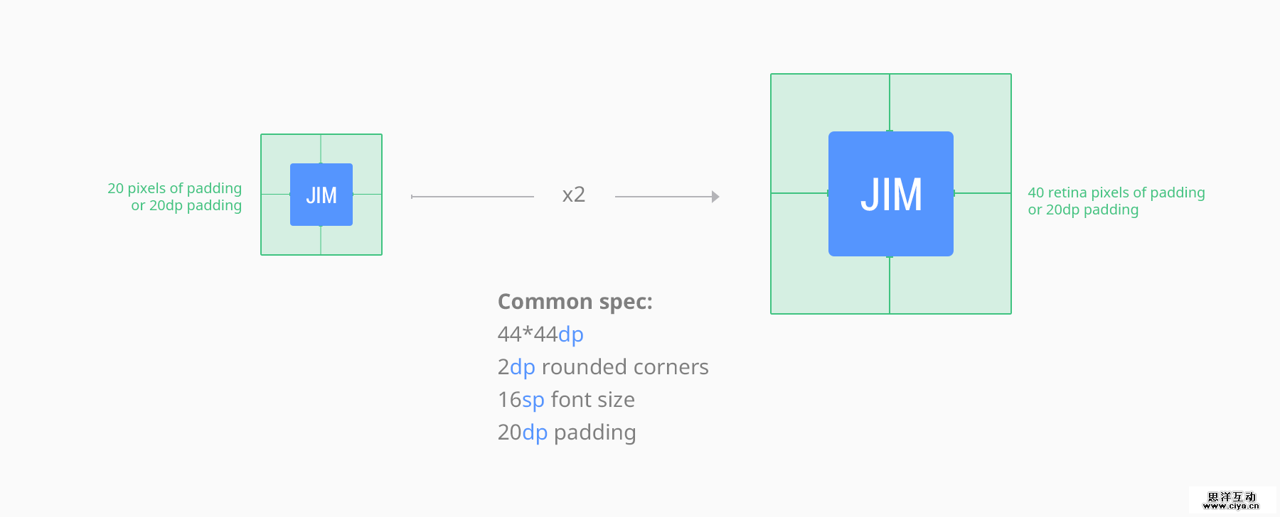 继续说前面“Jim”按钮的例子。 Jim在标准的非Retina屏幕上宽度为44px,在Retina屏幕上是88px。从技术上给Jim添加20px的padding,在Retina上padding是40px。但是,当你基于非Retina屏幕设计时计算Retina的像素值并没什么意义。