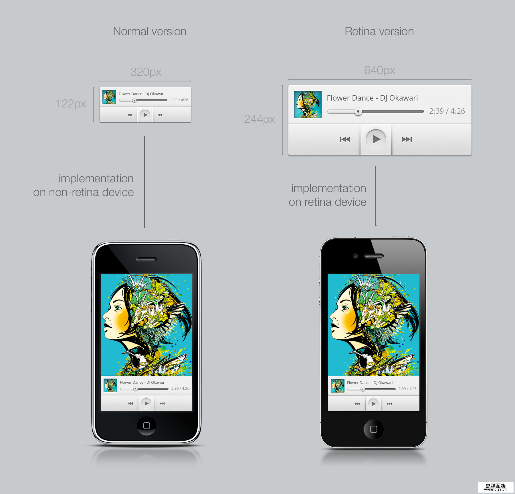 图注:在第三方设备上很难模拟出来自不同设备的不同图片质量,如上图所示,Retina的音乐播放器虽然与iPhone 4的音乐播放器有相同的物理空间,但图片质量看上去比iPhone 4好了两倍并且更清晰。如果大家想在本地进行验证,我会提供免费的演示事例源码,供大家下载(http://sebastien-gabriel.com)。