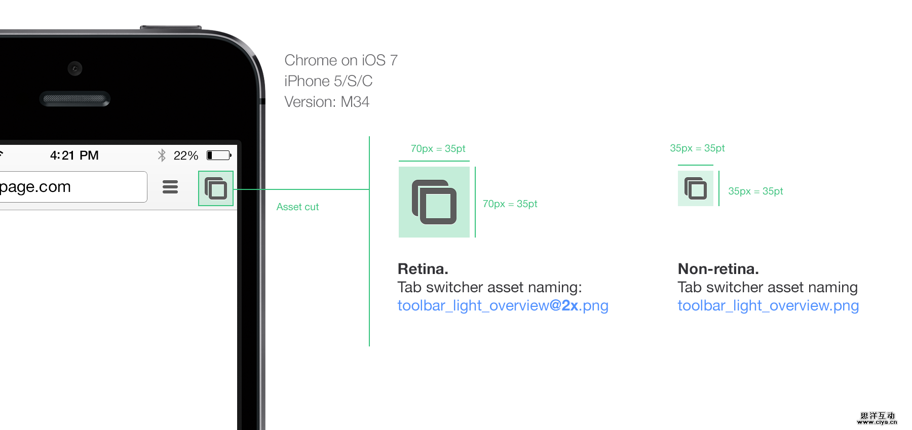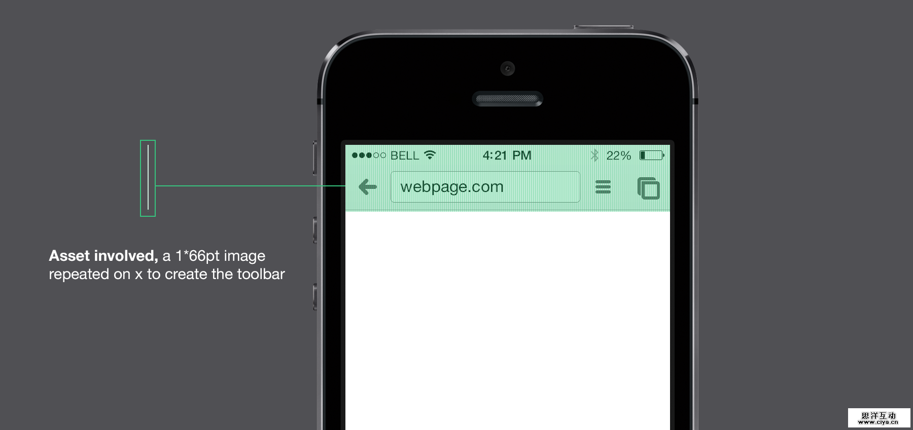 看看下面这个Chrome的例子。iOS上的工具栏在整个屏幕上只用了一个在x轴上平铺的超细资源。