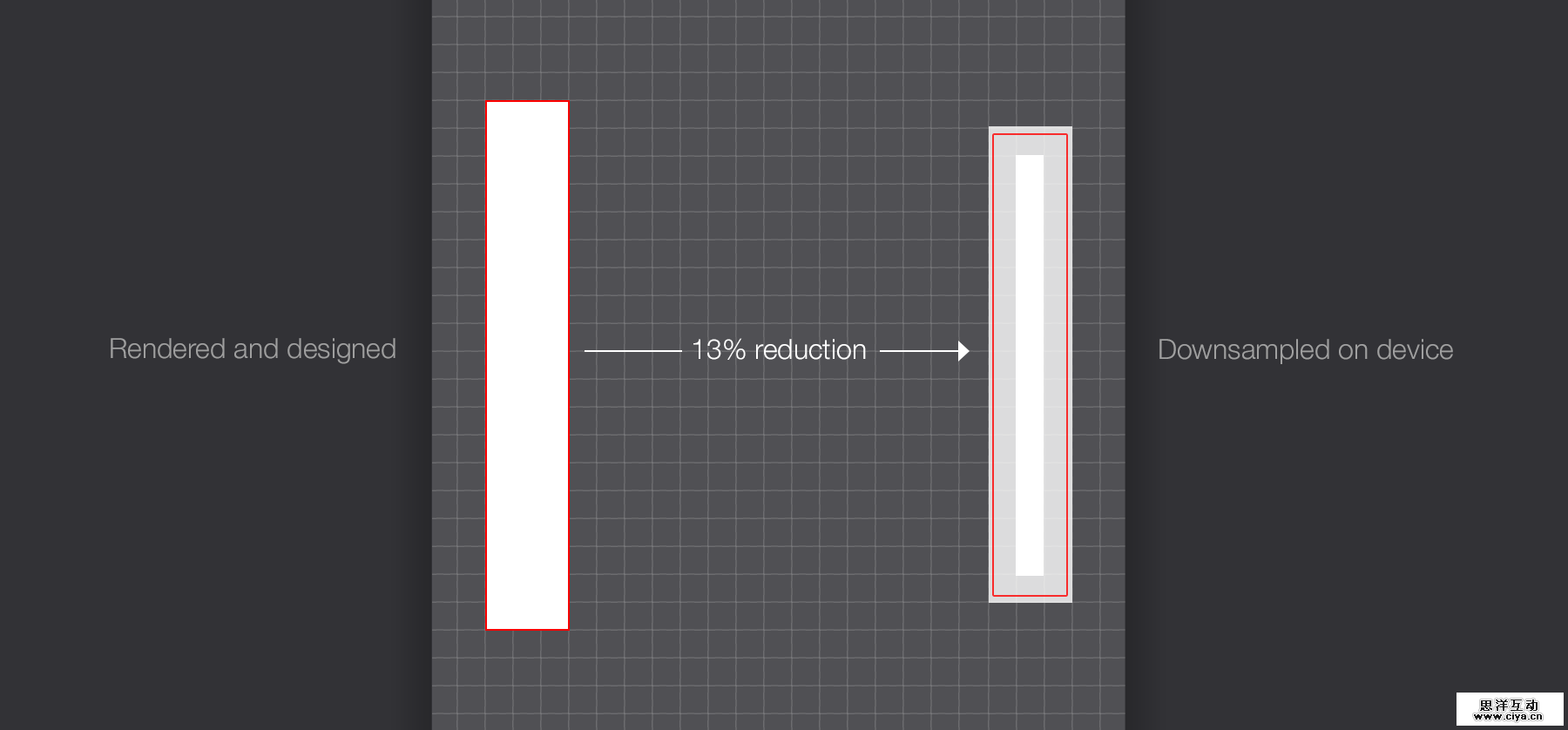 物理分辨率比渲染分辨率小15%,会造成一些细节问题,比如半像素使得精细的地方变模糊。分辨率如此高也是很微妙的,除非你近距离观察。因此,在2208*1242px的画布上设计,需要注意设计中真正精细的地方,像是分隔符。模拟如下: