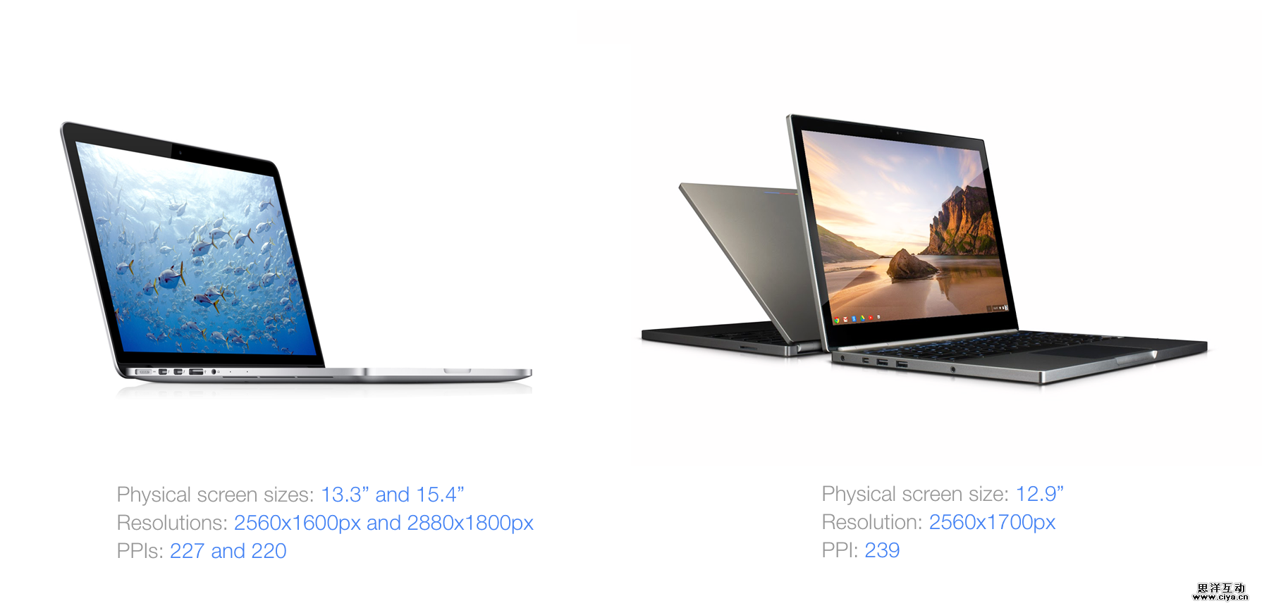 Mac(OSX)和Chrome OS在处理PPI方面是十分相似的。 两个OS都支持常规的PPI(100%)和hi-res/retina PPI(200%)。像iPhone和iPad,就只有2x像素比。