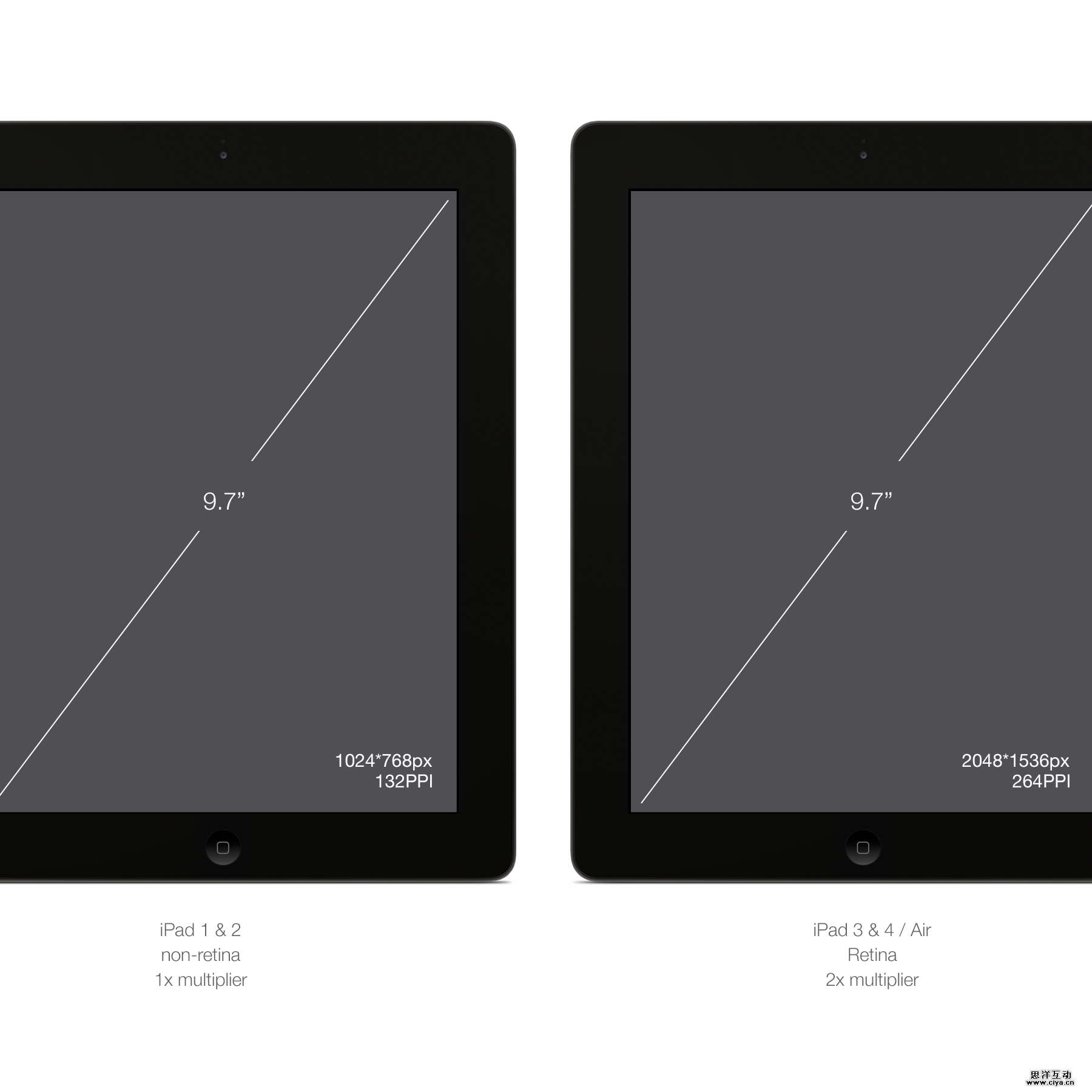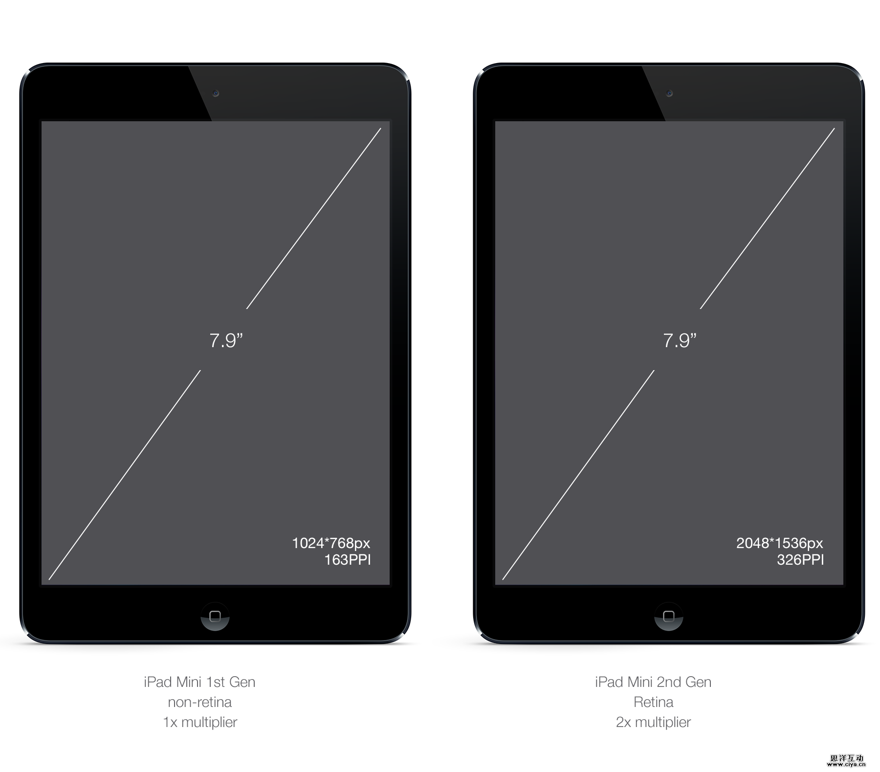 最后说说iPad。除了iPad 第一代,其余的都用的是iOS7,同时只有iPad2和iPad mini是非Retina屏幕。从设计的角度来看,iPad mini只是普通的iPad(一样的PPI屏幕),但是物理体积更小,也就是说它们拥有相同的分辨率,只是大小从9.7英寸减小到了7.9英寸。保持同样的比例,便会相应地增大像素点的密度,你的虚拟资源就会显得更小了。