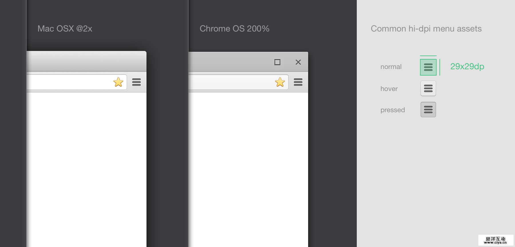 Chrome的工具栏按钮资源就是相似性最好的例子。我们在两个平台上使用完全相同按钮,即使代码不同,视觉上也是一样的。看下面这个chrome菜单按钮的例子。