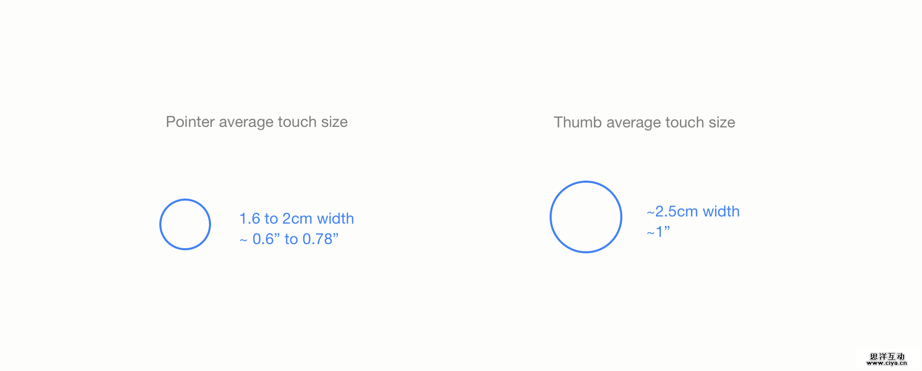 这里有交互中最常用到的两根手指(食指和大拇指)的平均大小,这代表了触摸区域和被手指遮挡了的区域。实际的触摸区域(例如,你手指接触屏幕的那部分)当然会小一点并且更准确,除非你把你的手指压在屏幕上。