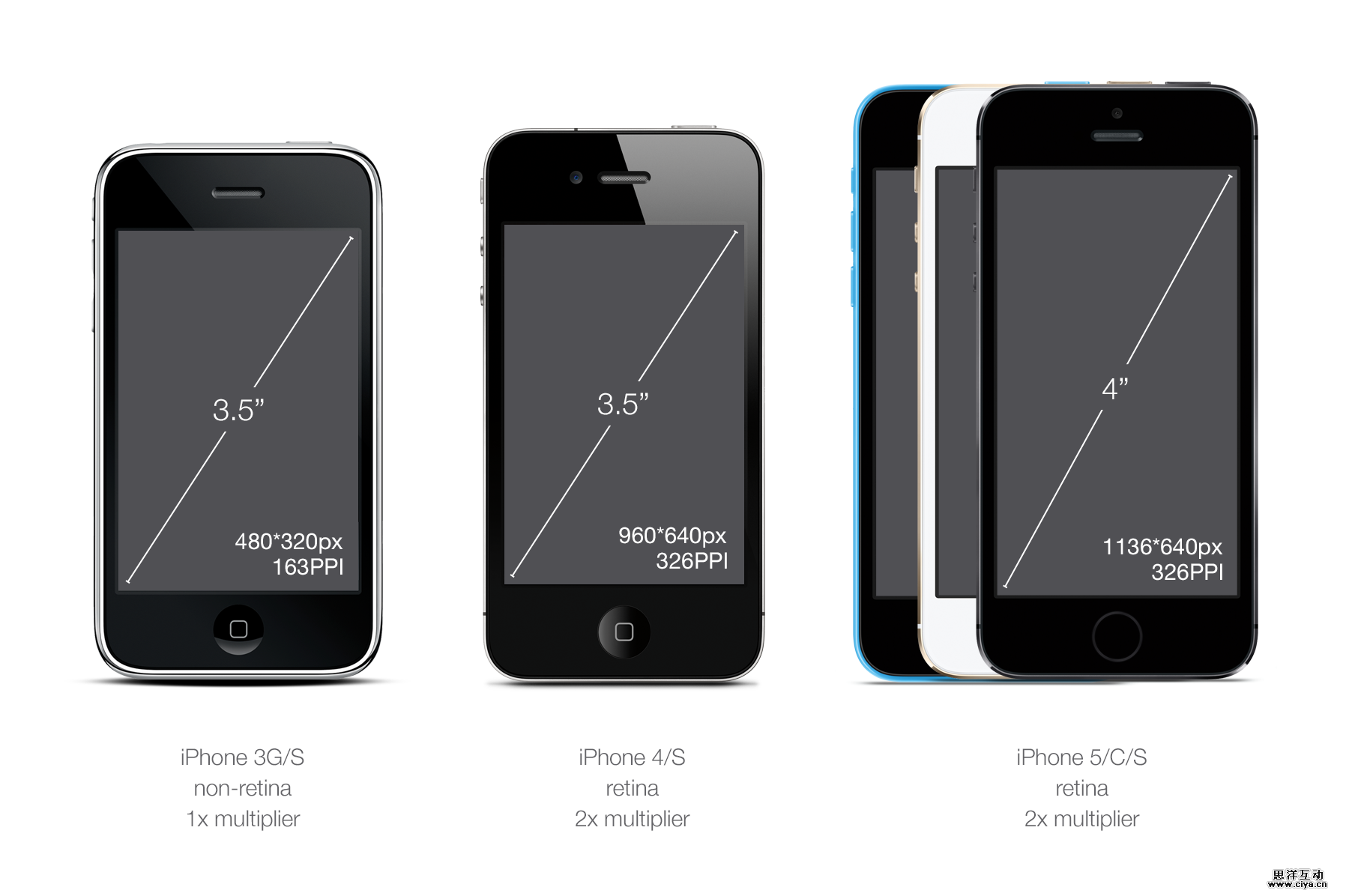 对于手机,有iPhone和iPad。 在手机分类中,有过去的3GS(iOS6依旧支持)和更高版本,其中只有iPhone 3GS是非Retina。iPhone 5以及后来的都用了和iPhone 4/4s有相同DPI的更好的屏幕。让我们来看看下面的列表: