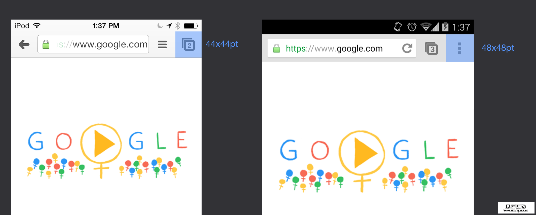 如你所见,两个平台上工具栏都是被推荐的触摸目标的高度。可视范围在iOS和Android上分别是4444pt和4848pt的正方形,这不仅使得UI在大小方面和其他OS保持一致,而且也能让与用户交互的部分都保持最小的规格。