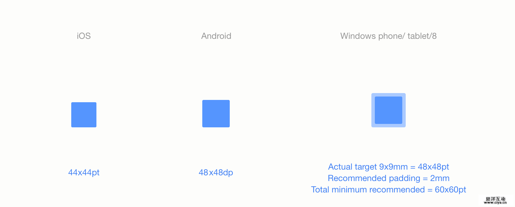 如你看到的,每个OS都有一系列自己的推荐规范,但是都在48pt左右。Windows的规格是包含了padding的,所以我把它加到这里。