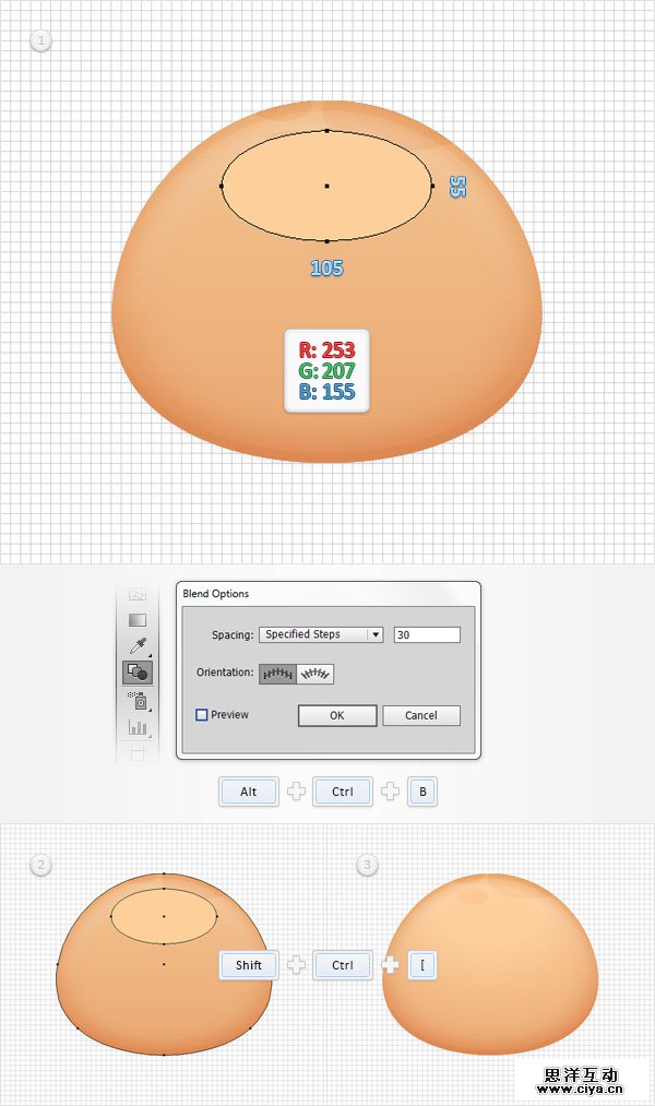 看你的工具栏双击混合工具打开混合选项窗口,在间距下拉菜单中选择指定的步数,输入30然后点击确定按钮。重新选择这步中建立的形状和你的 “脑袋” 形状,然后按下Alt-Ctrl+B(或者对象 > 混合 > 建立) 来建立一个新的混合。选中你的混合并按下Shift+Ctrl+ [将其放到后面去。