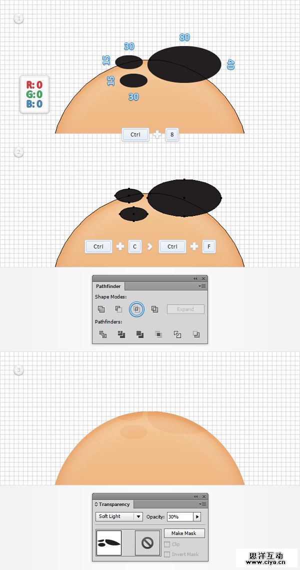 选中你的 “脑袋” ,然后在前面做两个拷贝(Ctrl+C > Ctrl+F > Ctrl+F)。选中顶端的副本,并将其向上移动5px。再选中这步做出的这两个副本,并在路径查找器面板中点击减去顶层按钮。将生成的形状填充为黑色,降低其不透明度到10%并将混合模式改为柔光。
