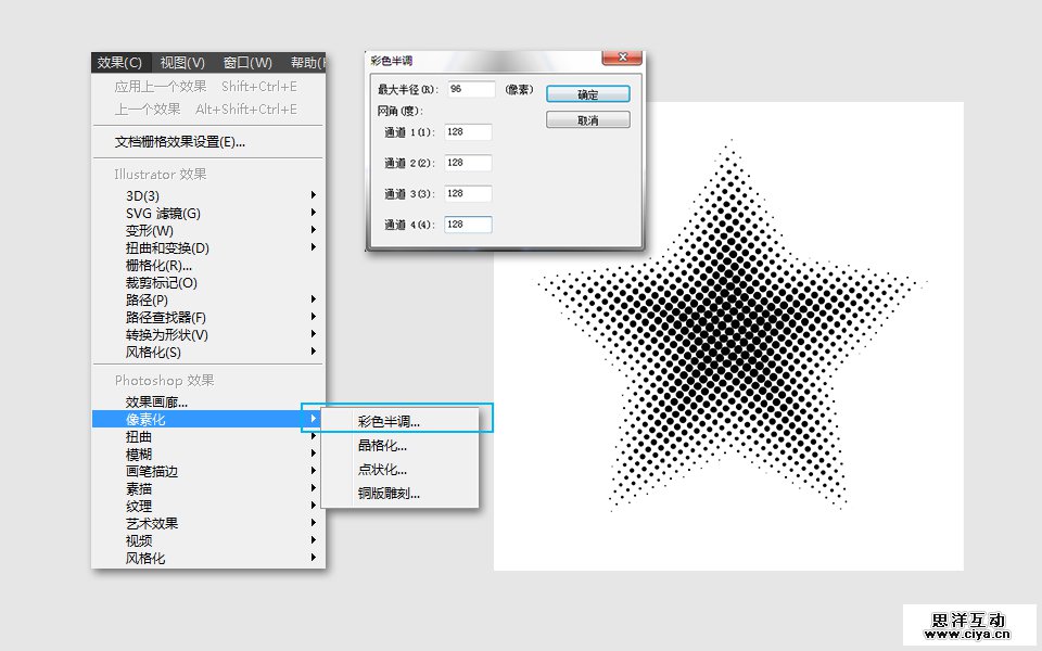 选中图案,进入【效果>像素画>彩色半调】,应用彩色半调的效果后,画布上会弹出一个效果设置面板,将最大半径设置为96,剩下的四项通道数值分别设置为128。其中,最大半径就是对圆点大小的设定,如果大一点的半径相应圆点也会大一些。而所谓“网角度”,角度范围是-360到+360度,是对颜色信息的设置。