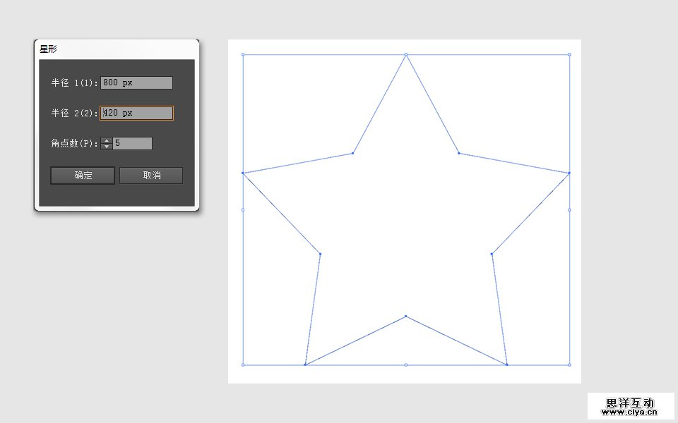 利用星形工具,选中星形工具图标,在画布的任意地方双击两下,这时会弹出星形工具设置面板。在设置中,将半径1设置为800,半径2设置为420,角点数设置为5。这些数值所表达的意思,相信大家可以通过不断尝试获得自己的理解。在此不再赘述。这时保持黑色描边,白色填充即可。