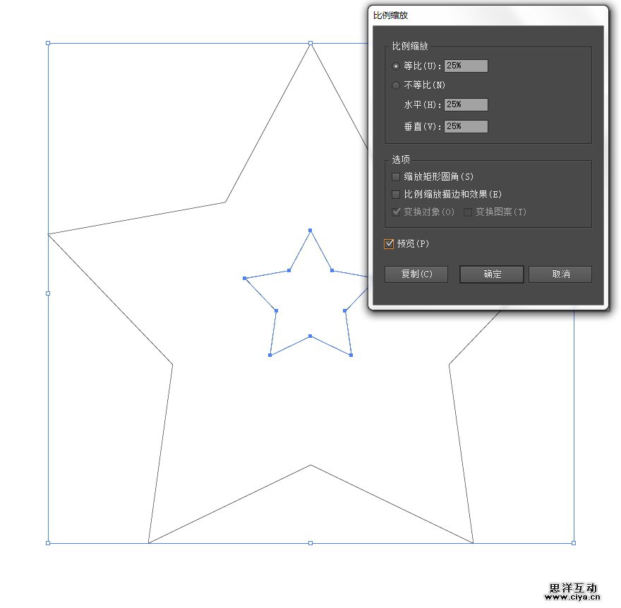 让我们再来画一个小的星形,选中已经画好的星形,利用快捷组合键ctrl+c复制,ctrl+f粘贴在前面。这时两个星形重叠在一起,表面上我们看不出任何变化。我们再选中复制的星形,然后点击右键,选择【缩放】,在缩放面板中等比缩放里设置25%。这就是把原有图形按等比例大小缩放。