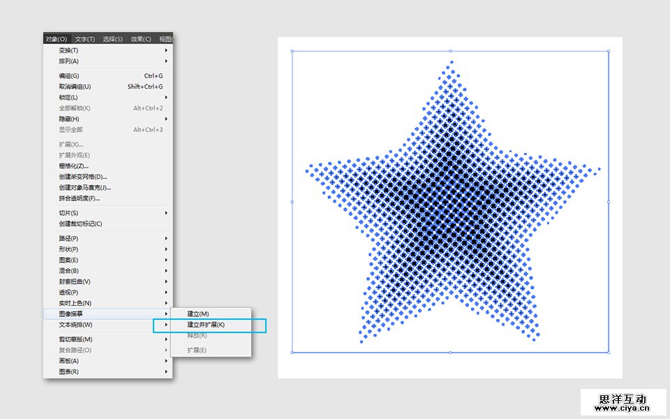 效果应用完成后,现在已经是一个位图图象了。说好的是矢量呢?没错,这时我们就要用到另一个工具将位图转为矢量图。选中图形,进入【对象>扩展外观】,然后接着继续在对象栏目下选择【对象>图像描摹>建立并扩展】,这个工具可以将位图变回矢量图形。
