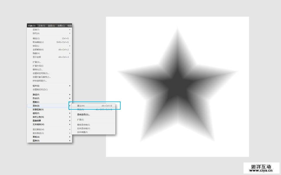 首先,还是让我们先来为两个图形上色,关掉两个图形的描边,将小星形设置为深灰色#4D4D4D,大的星形保持白色填充。选中两个星形,进入【对象>混合>建立】,这时,混合工具就将图形变为了一个渐变过渡的星形。